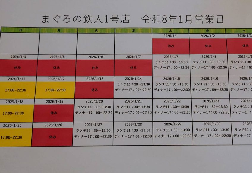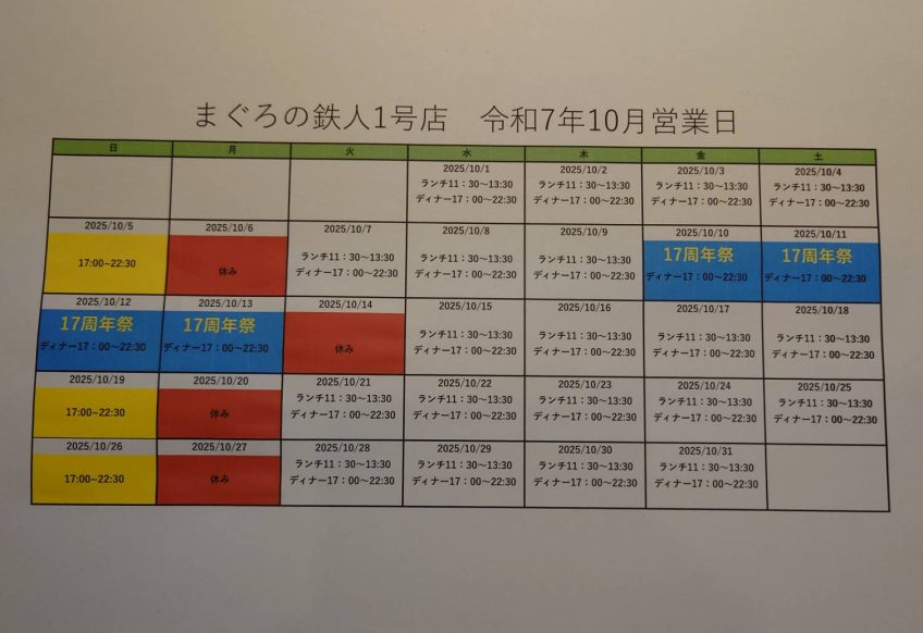 いつもまぐろの鉄人をご利用頂き、ありがとうございます ランチ 11:30~13:30(L.O.13:15) ディナー 17:00~22:30(L.O.22:00) 酒類/テイクアウト/フード/ソフトドリンク 定休...