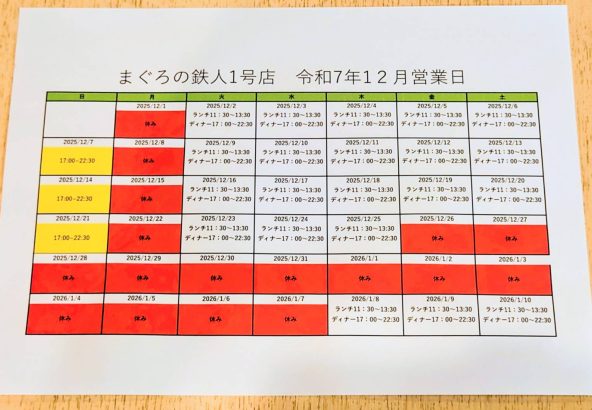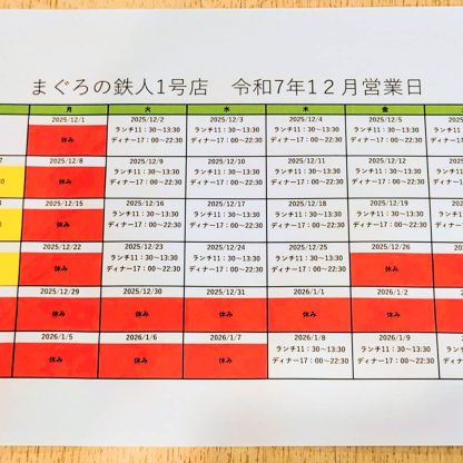 令和7年12月、令和8年1月の営業日/営業時間です